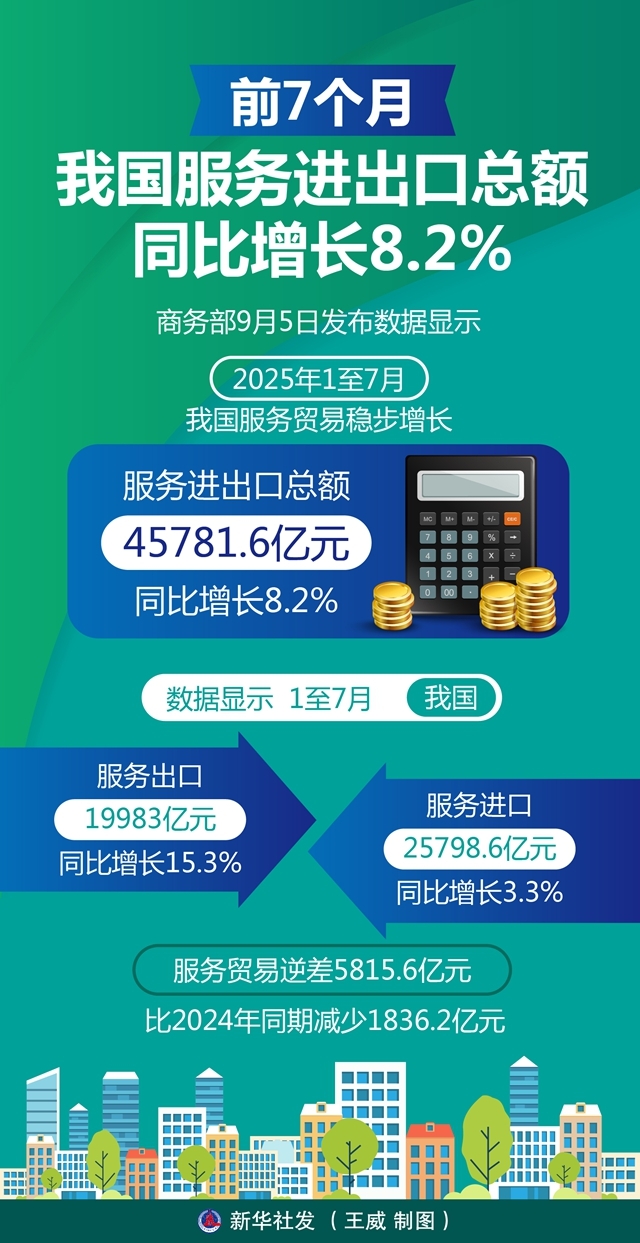 商务部9月5日发布数据显示,2025年1至7月,我国服务贸易稳步增长,服务进出口总额45781.6亿元,同比增长8.2%。
