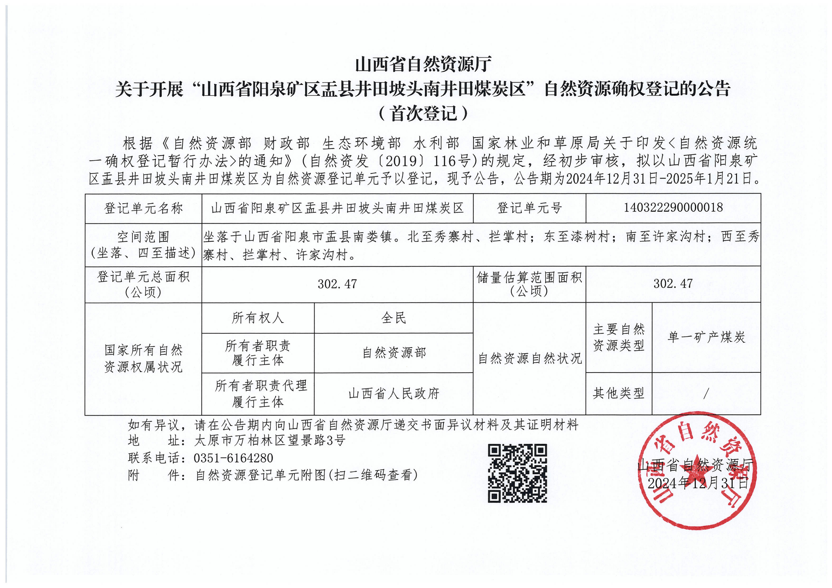 山西省自然资源厅关于开展“山西省阳泉矿区盂县井田坡头南井田煤炭区”自然资源确权登记的公告(首次登记)