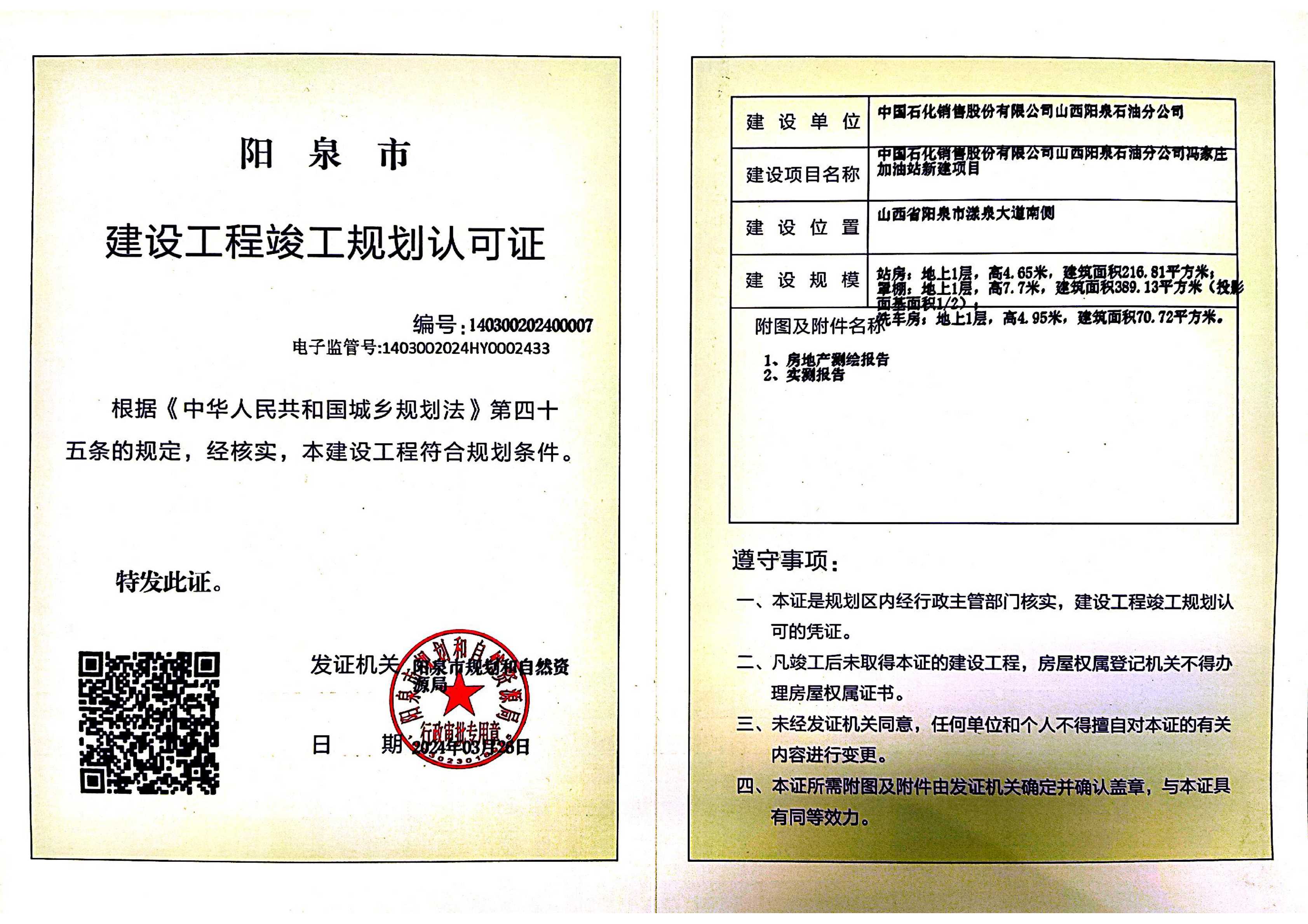 中国石化销售股份有限公司山西阳泉石油分公司冯家庄加油站新建项目建设工程竣工规划认可证