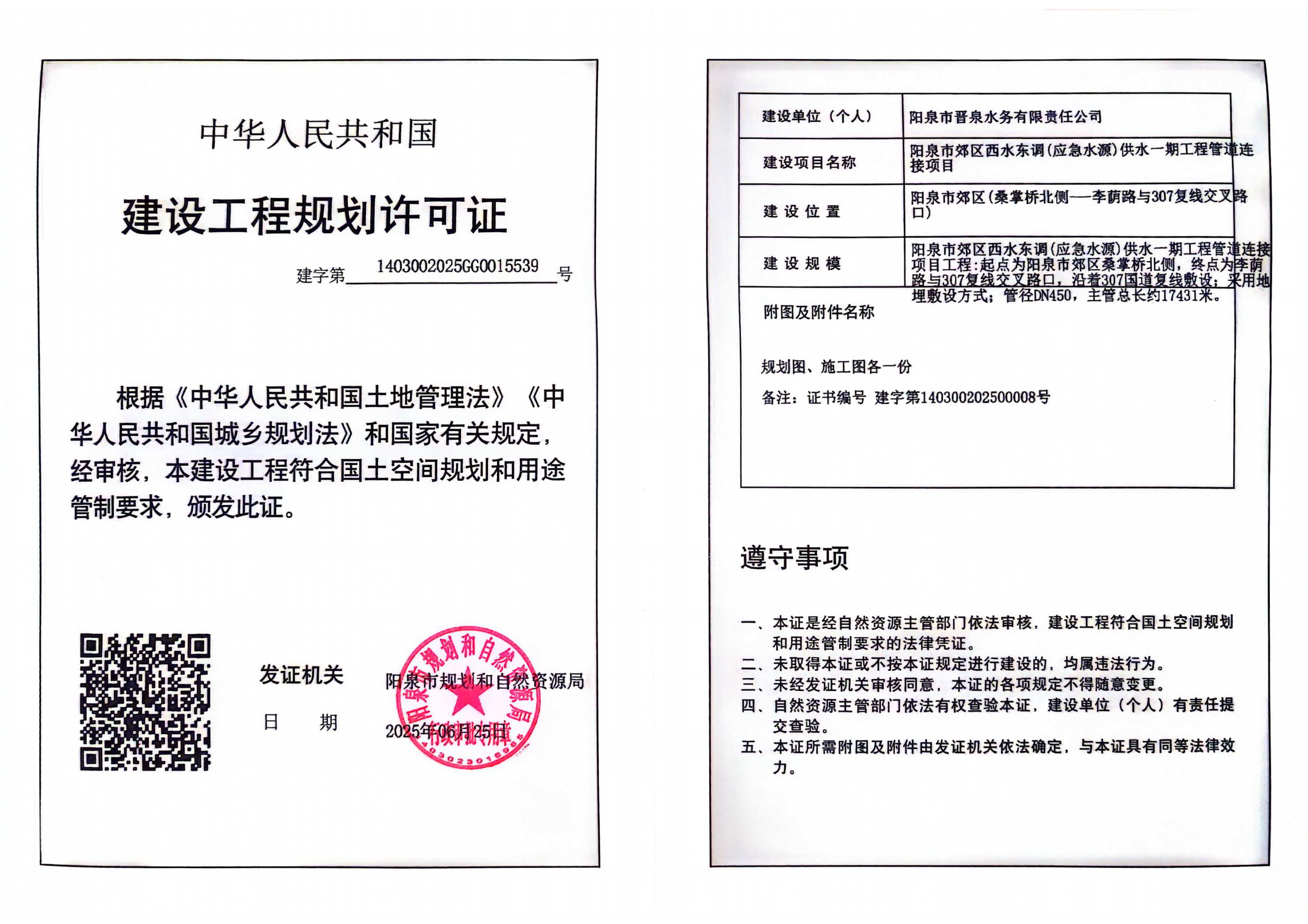 阳泉市郊区西水东调(应急水源)供水一期工程管道连接项目建设工程规划许可证