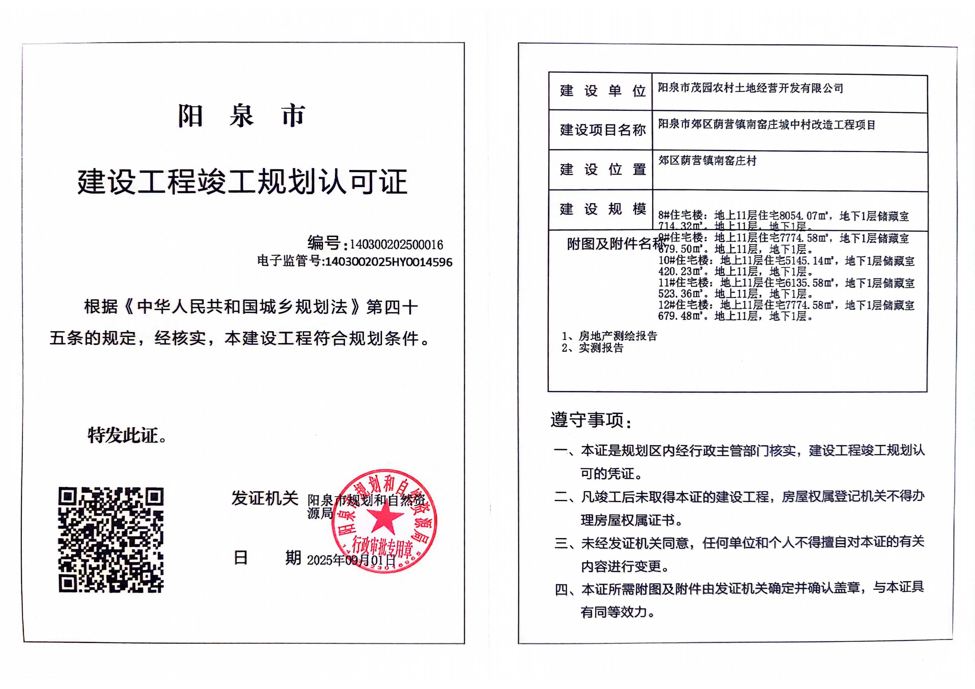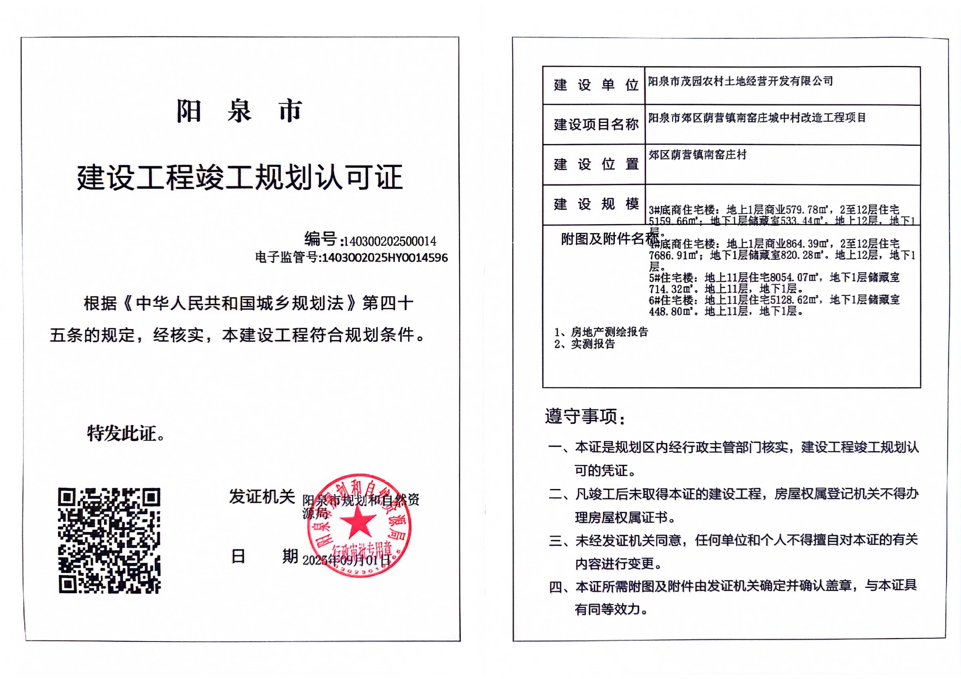 阳泉市郊区荫营镇南窑庄城中村改造工程项目建设工程竣工规划认可证