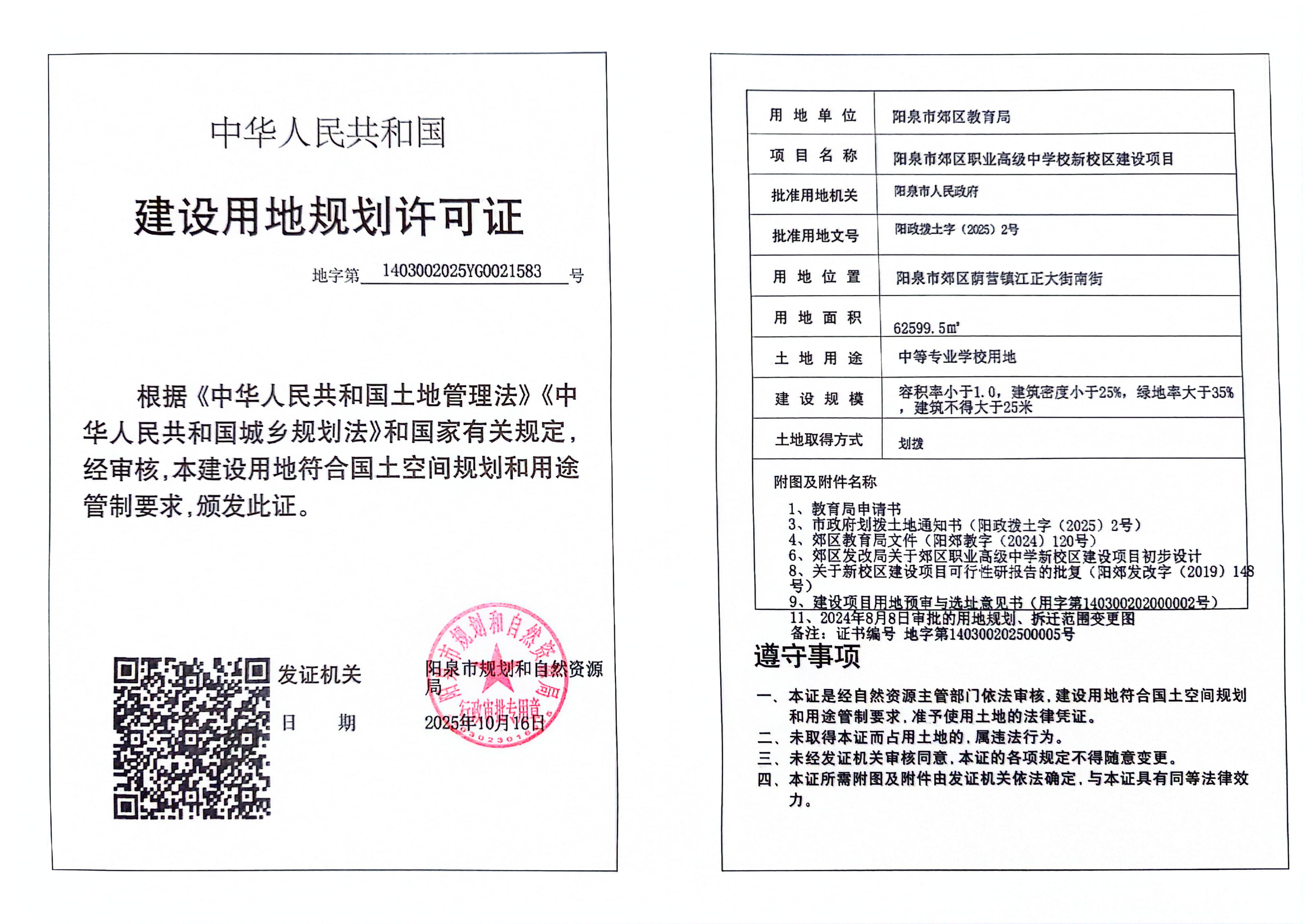 阳泉市郊区职业高级中学校新校区建设项目建设用地规划许可证