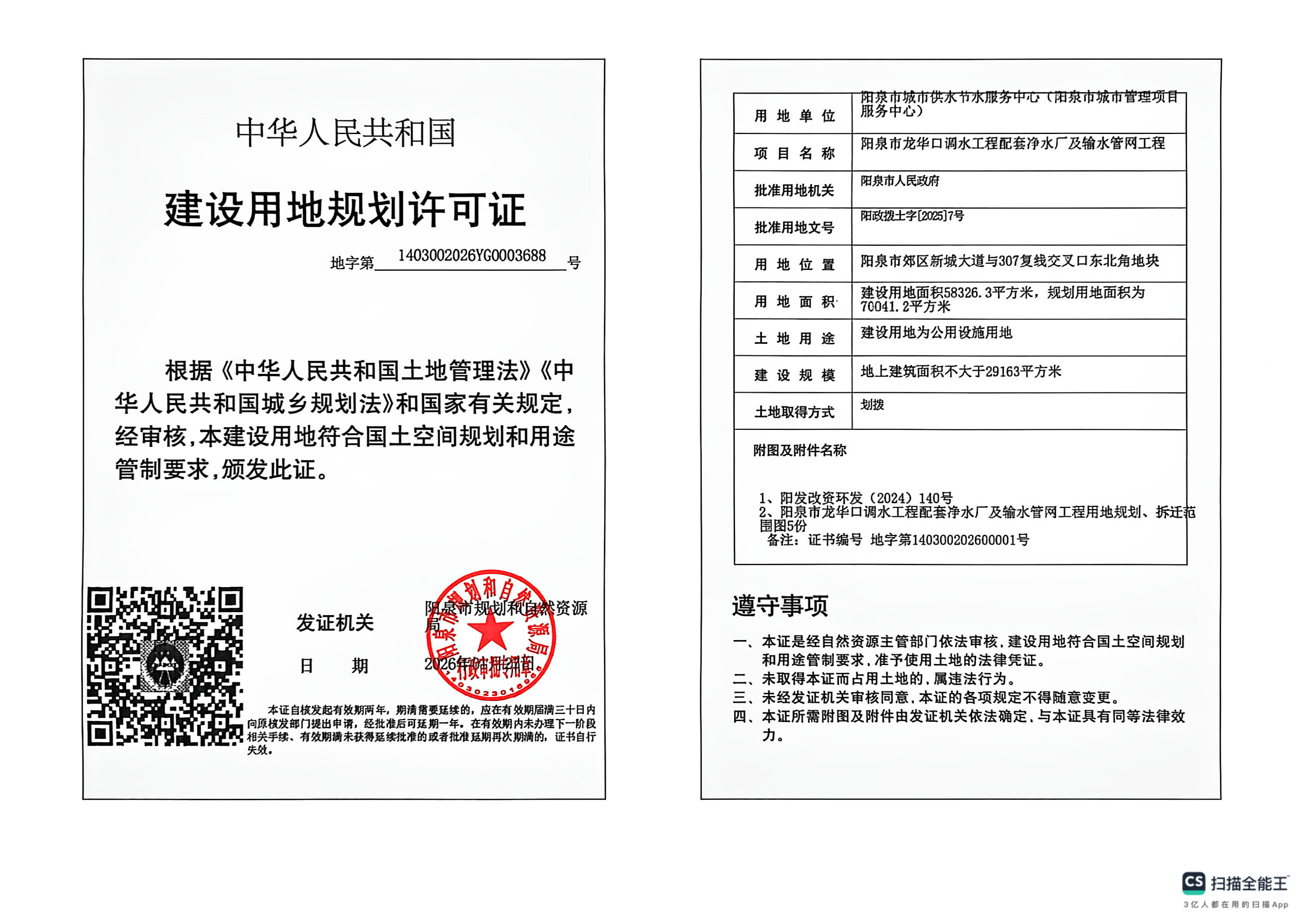 阳泉市龙华口调水工程配套净水厂及输水管网工程建设用地规划许可证