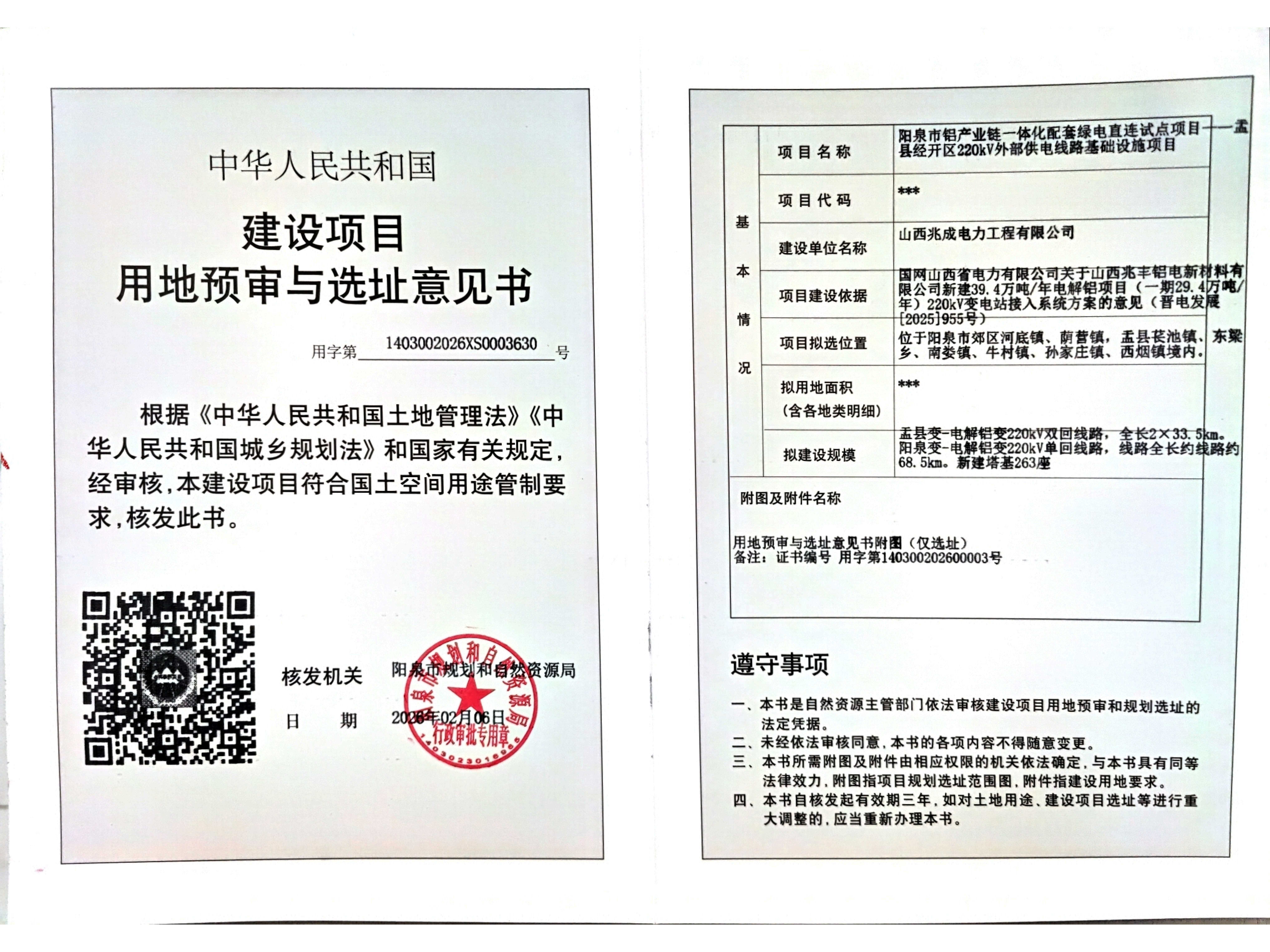 阳泉市铝产业链一体化配套绿电直连试点项目——盂县经开区220KV外部供电线路基础设施项目用地预审与选址意见书